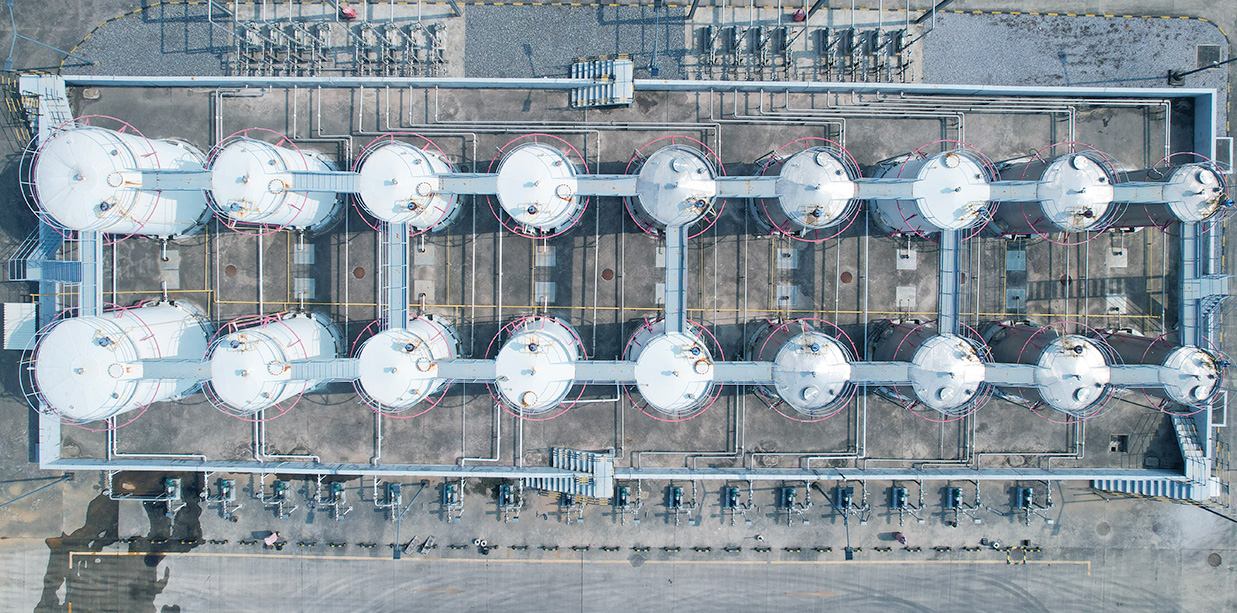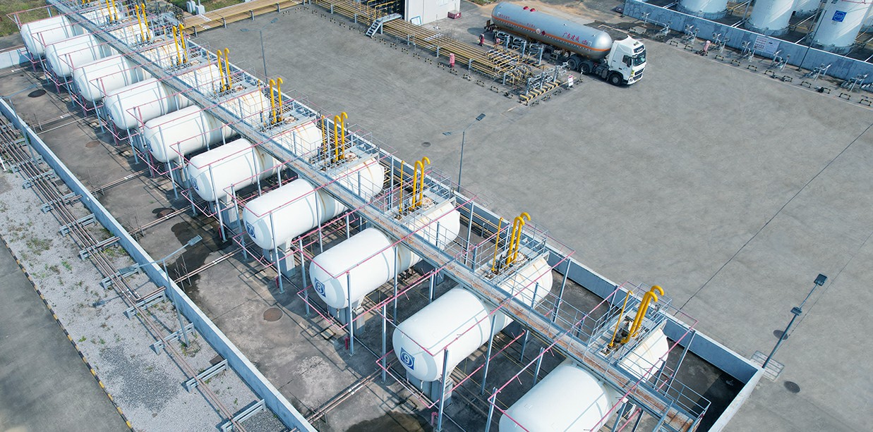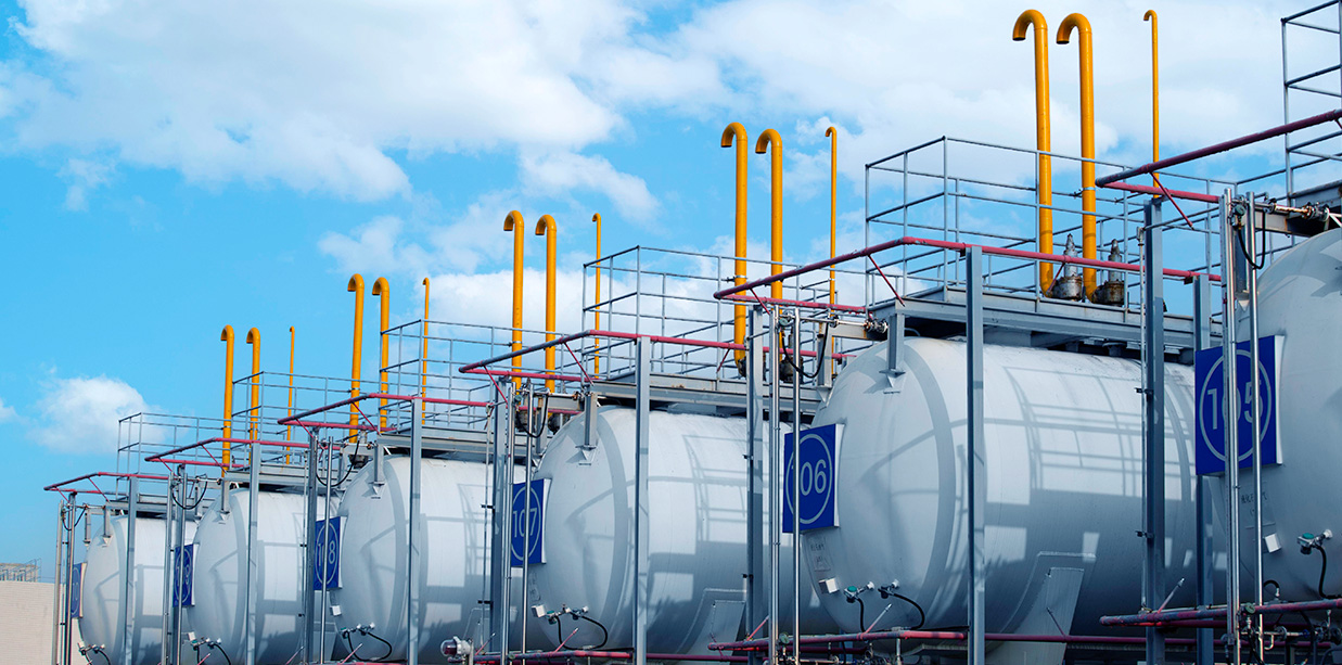 萊雅擁有大型的油氣庫儲存基地,分為拋射劑儲罐區(qū)、立式液體儲罐區(qū)。其中有10個拋射劑儲罐,可儲存氣體500m3;18個立式液體儲罐,可儲存溶劑490m3。
