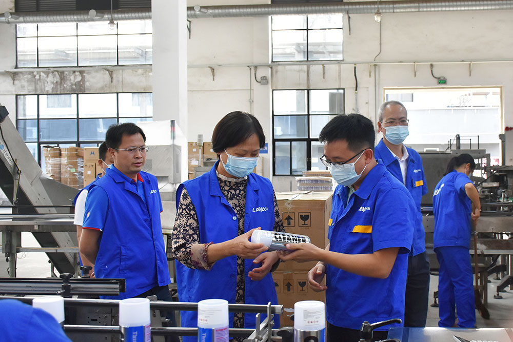 在萊雅相關(guān)人員的陪同下,調(diào)研組深入廠區(qū)車間進(jìn)行參觀,了解各工序的生產(chǎn)情況。萊雅相關(guān)人員向調(diào)研組逐一展示了車間全自動(dòng)現(xiàn)代化生產(chǎn)線、生產(chǎn)設(shè)施設(shè)備、氣霧劑產(chǎn)品、消防安全裝置及排污處理系統(tǒng),并就萊雅的產(chǎn)品設(shè)計(jì)、生產(chǎn)工藝、質(zhì)檢流程、安全管理工作及廢氣廢水處理流程等方面向調(diào)研組進(jìn)行了詳細(xì)講解。