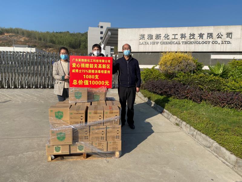 2022年12月21日,萊雅向韶關(guān)高新區(qū)有關(guān)部門捐贈(zèng)了1080支威博士75%酒精消毒噴霧劑,總價(jià)值1萬元,以實(shí)際行動(dòng)支持保障基層一線的防疫物資使用需求,充分彰顯了萊雅的責(zé)任與擔(dān)當(dāng)。