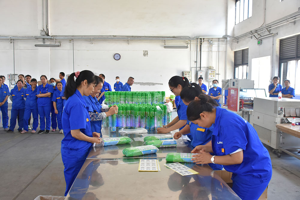 比賽一開始,參賽小組選手們排成兩列,分工明確,各司其職,前排負(fù)責(zé)套膜,后排負(fù)責(zé)粘貼標(biāo)簽,整個(gè)比賽有條不紊地進(jìn)行著。